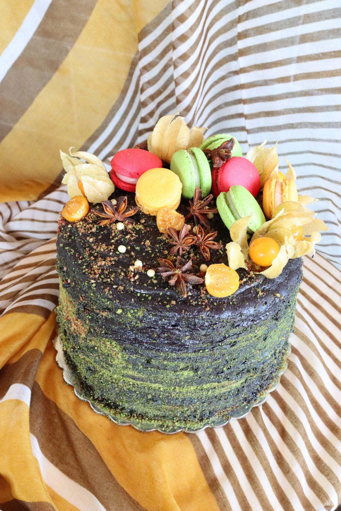Торта дъга – безглутенов десерт със стевия, крем с маскарпоне, орехи, домашно приготвени макарони и физалис.