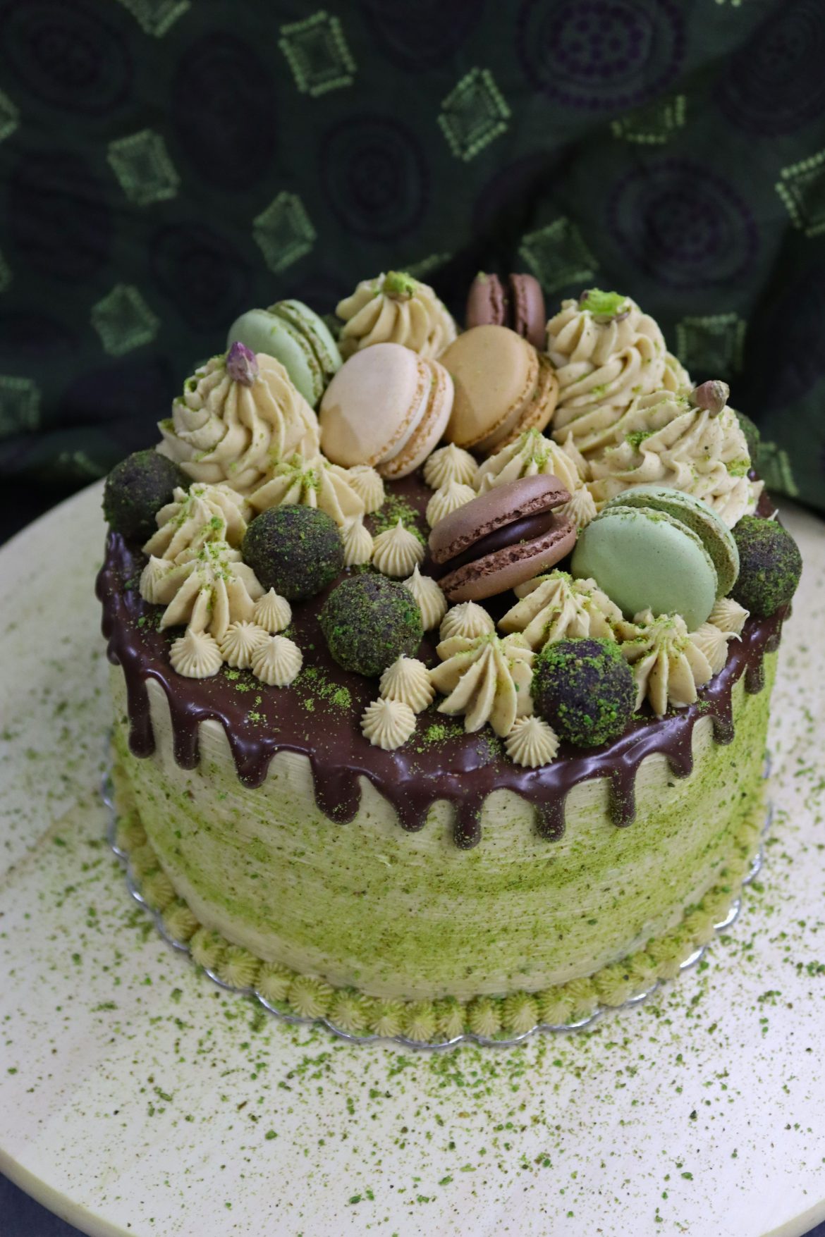 Двойно шоколадова торта с нерафинирана тръстикова захар и френски макарони. Крем от маскарпоне, сушени праскови и кокосов крем. Добавете шамфъстък и тахан от шамфъстък и ще добиете представа за вкусовете, които крие и може да разкрие тази торта.