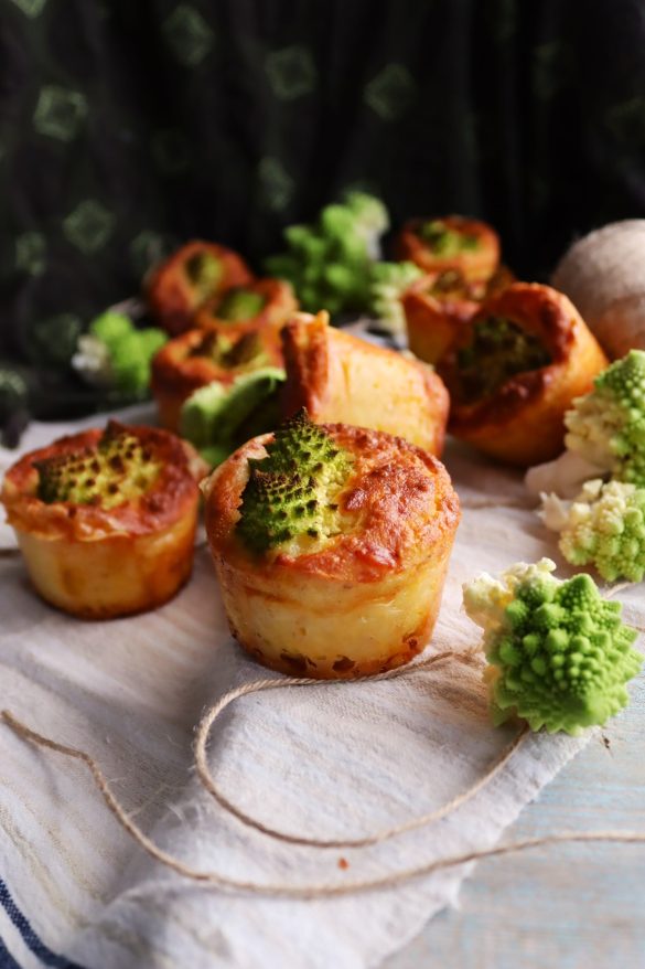 Солени мъфини по Зоната с ементал и броколи Романеско. Мъфини без глутен, обвити в юрганче от ементал – излети са в калъпче от това сирене. Благодарение на него те имат хрупкава коричка и мека сърцевина. Именно той ги кара да греят като есенно слънце.