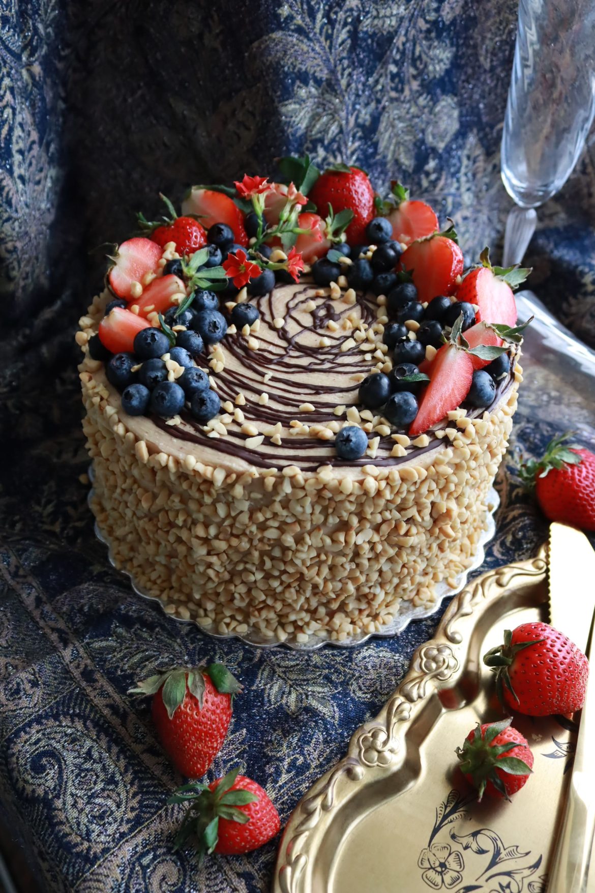 Безглутенова торта с фъстъци, фъстъчено масло, два вида шоколад и пресни плодове.