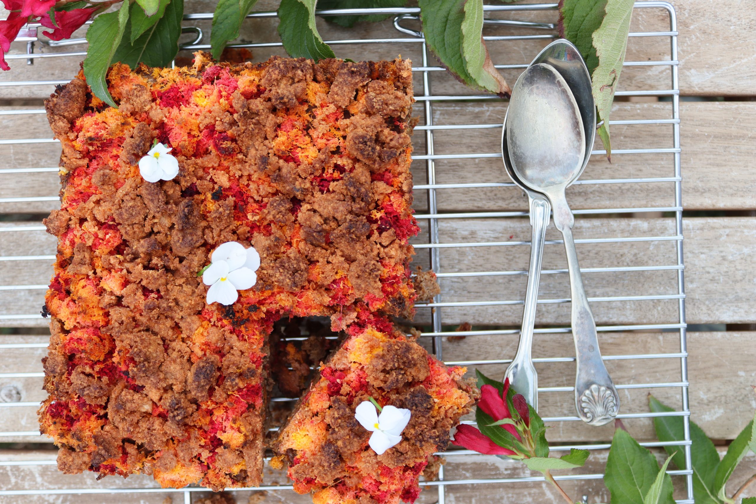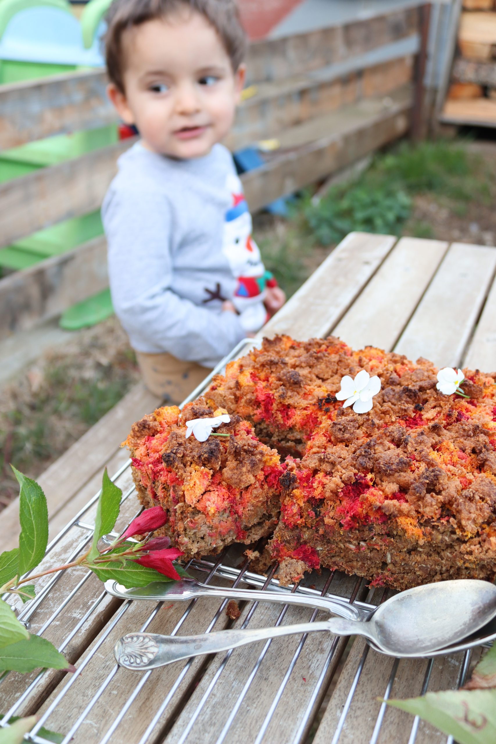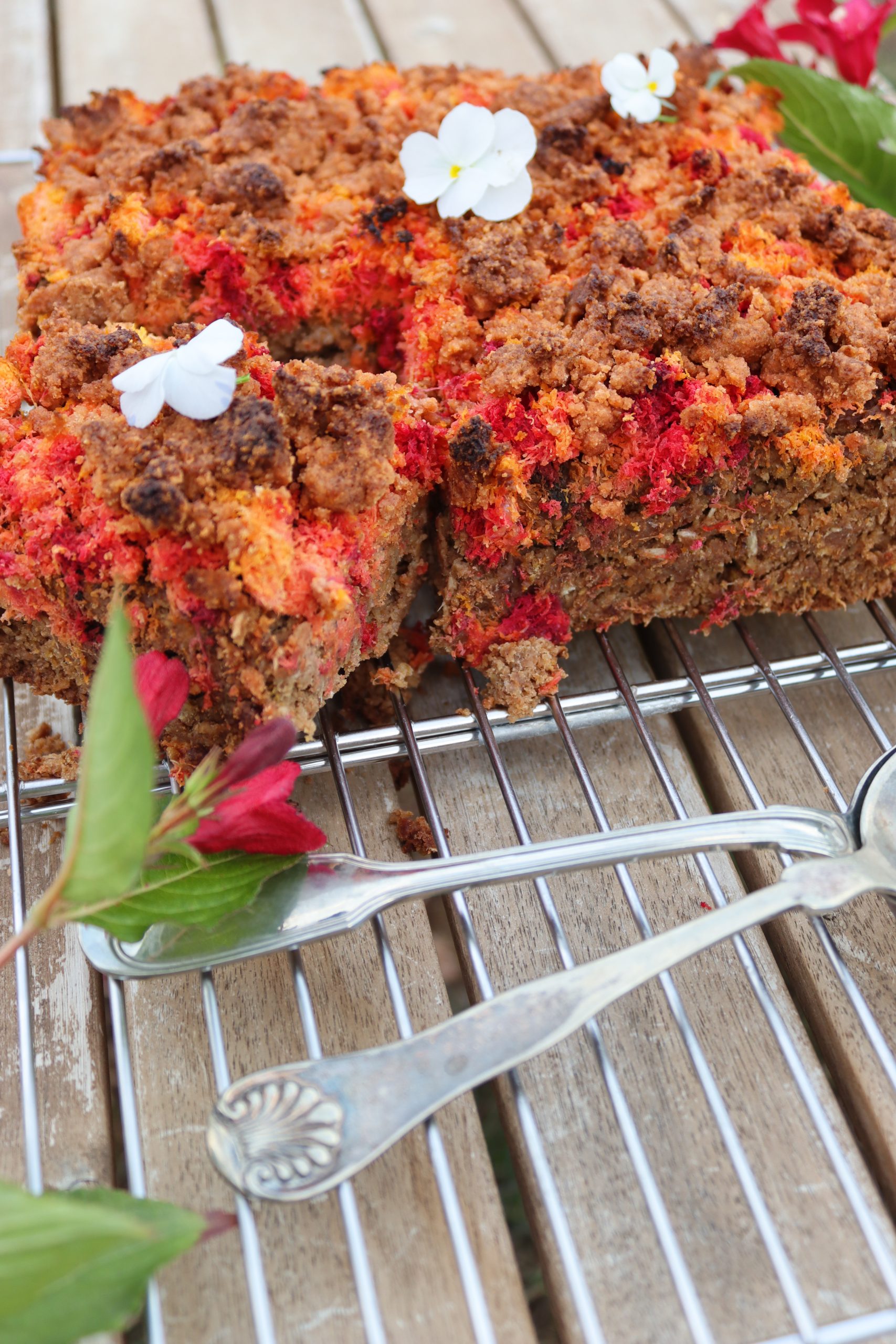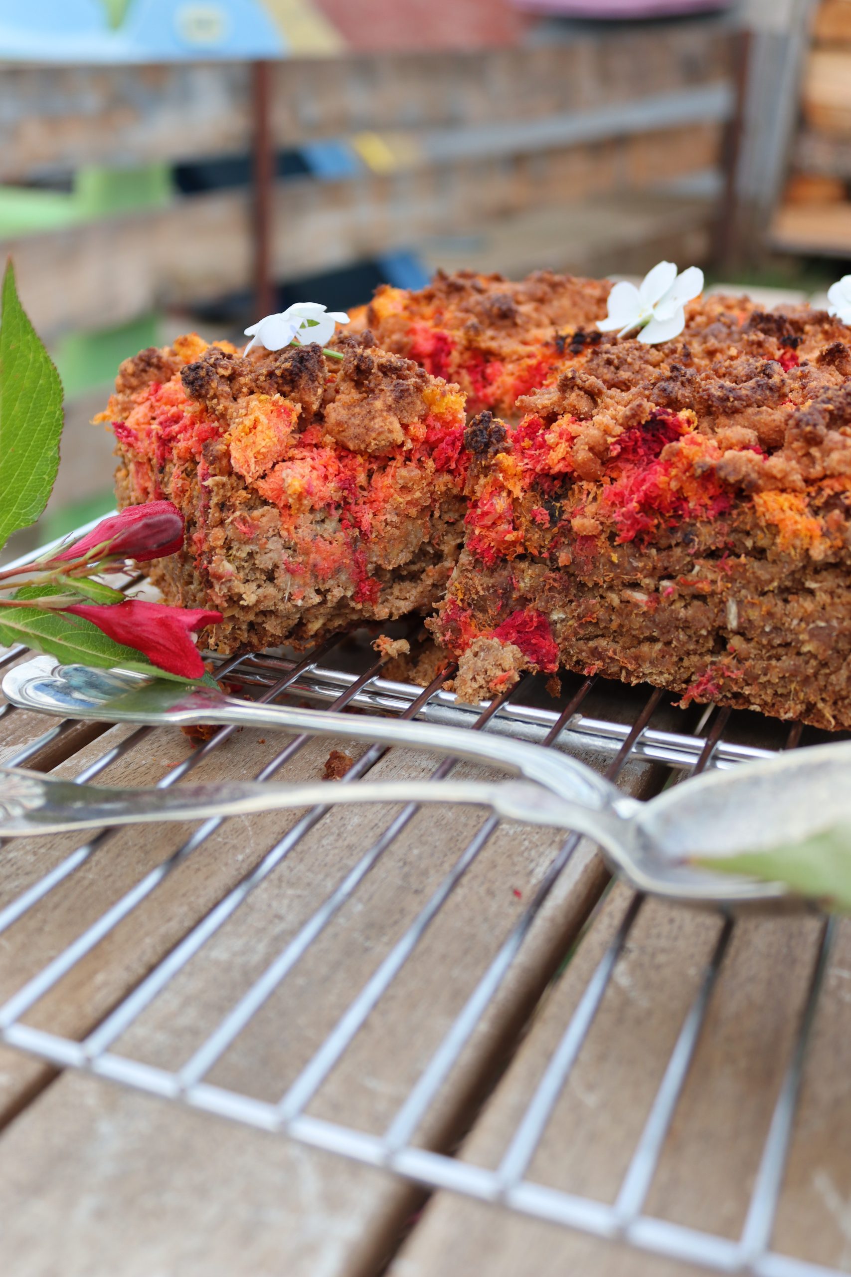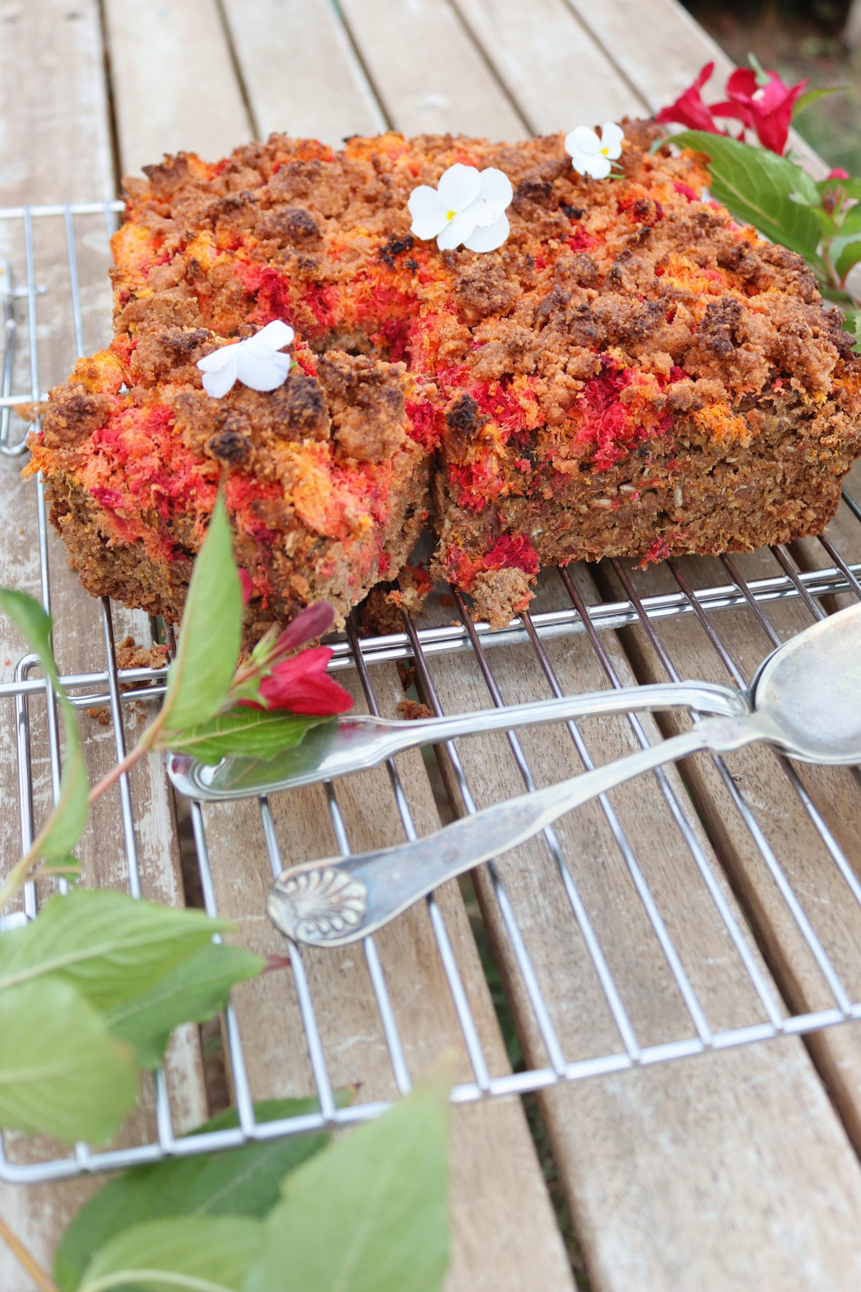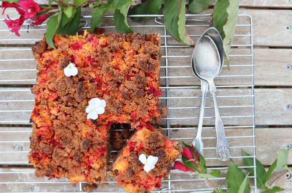 Изсипете овесената смес в тавичката и заравнете равномерно. Отгоре разпределете „опилките“ от моркови и цвекло. Поръсете с 2с.л еритритол, ако обичате по-сладък десерт.