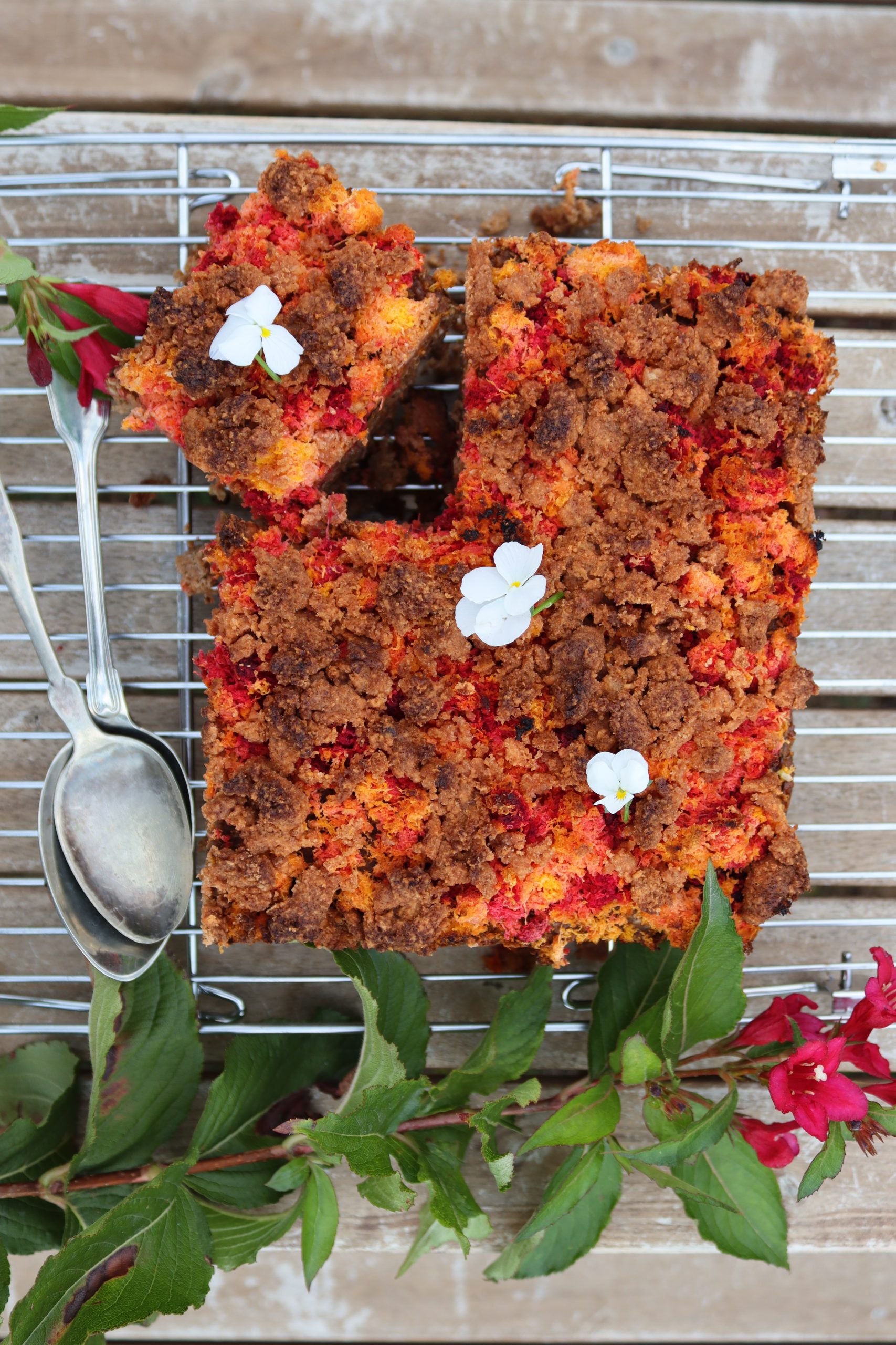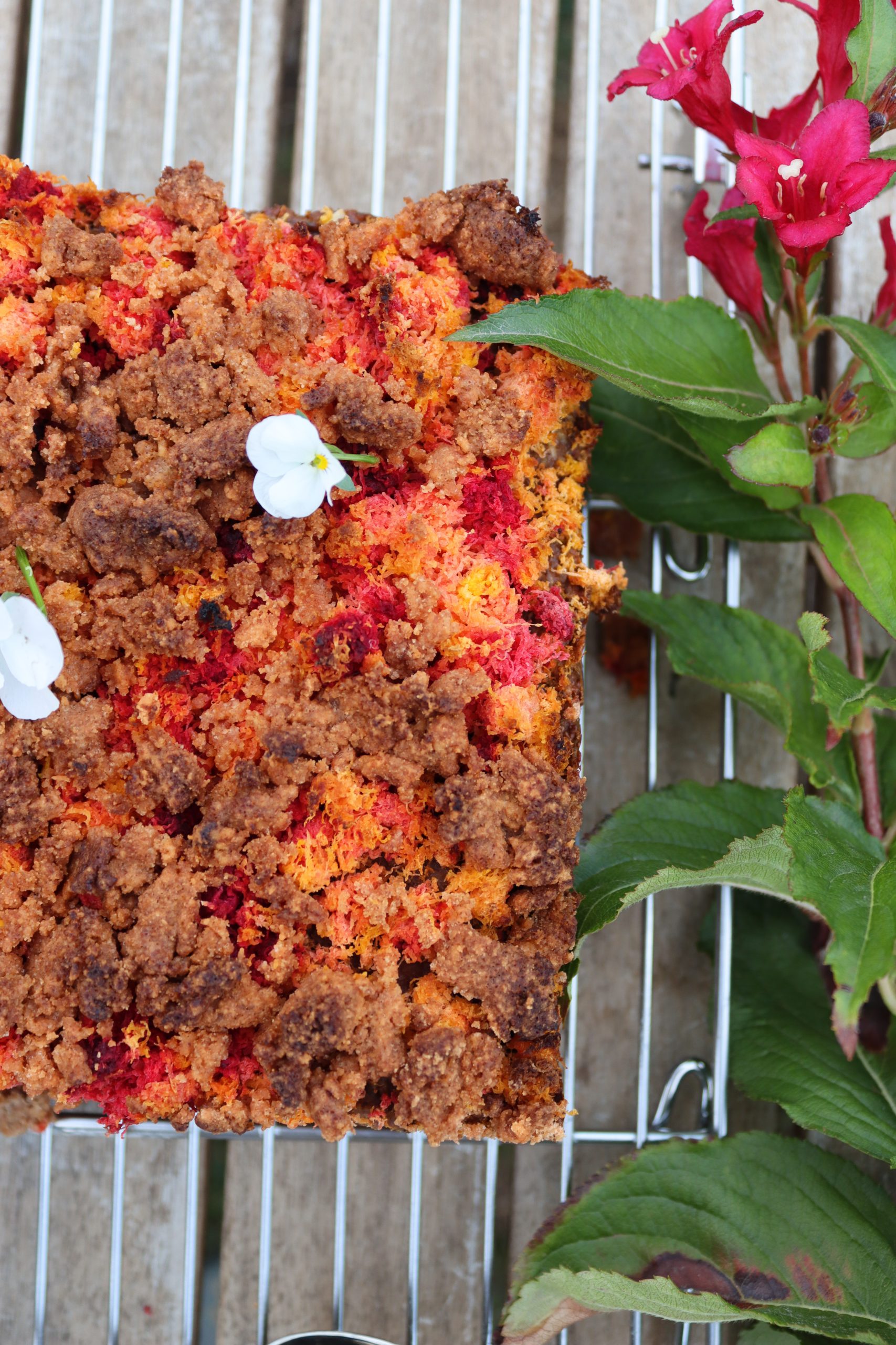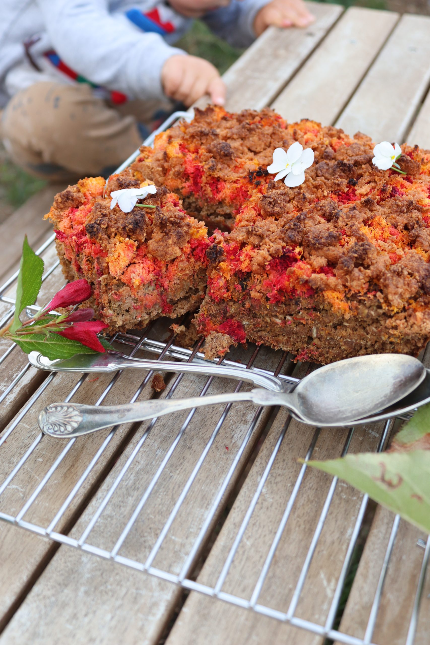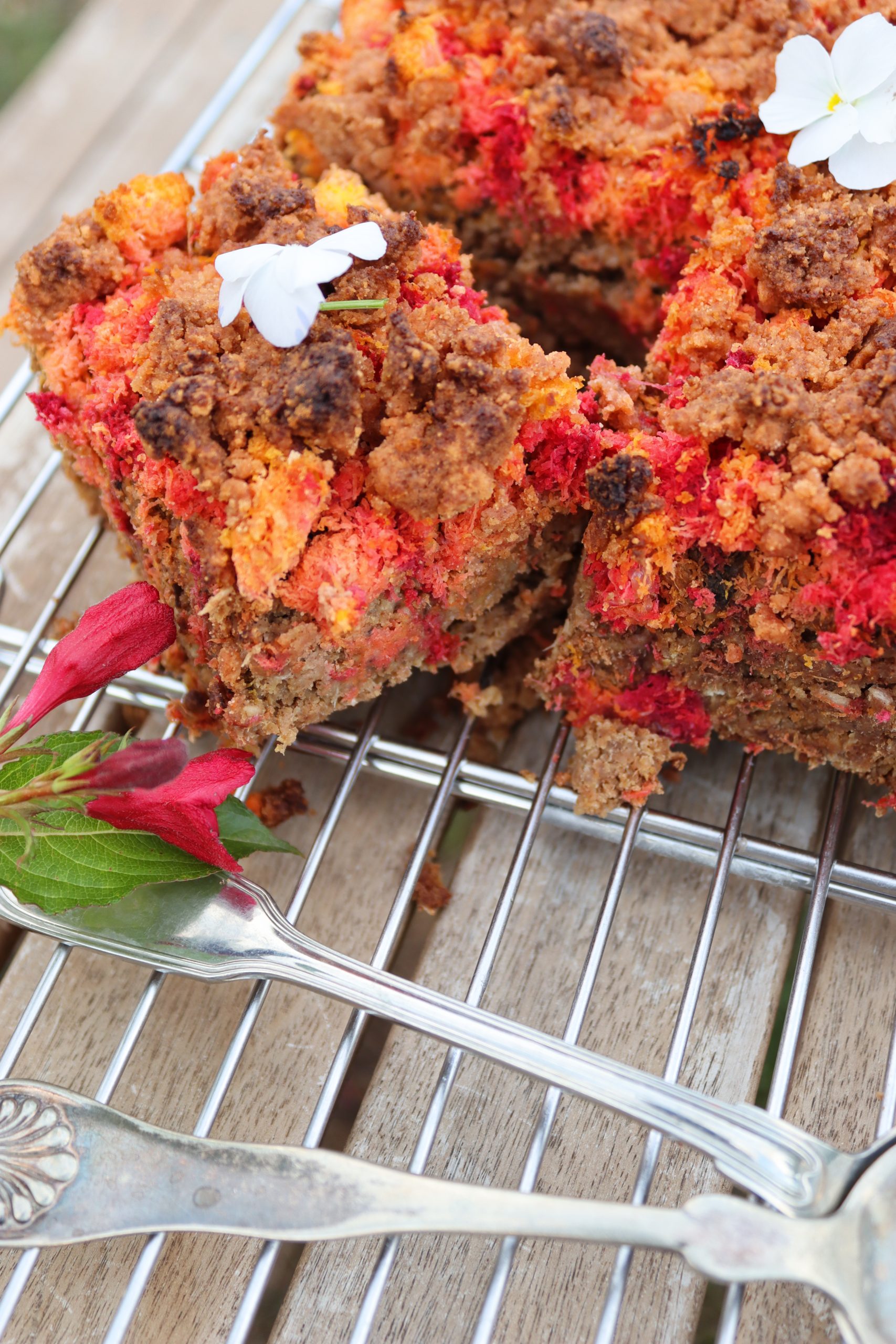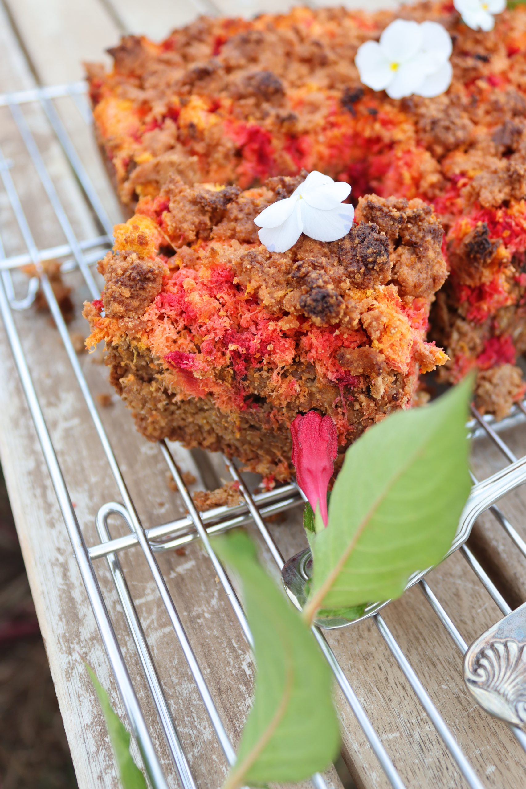 Изсипете овесената смес в тавичката и заравнете равномерно. Отгоре разпределете „опилките“ от моркови и цвекло. Поръсете с 2с.л еритритол, ако обичате по-сладък десерт.