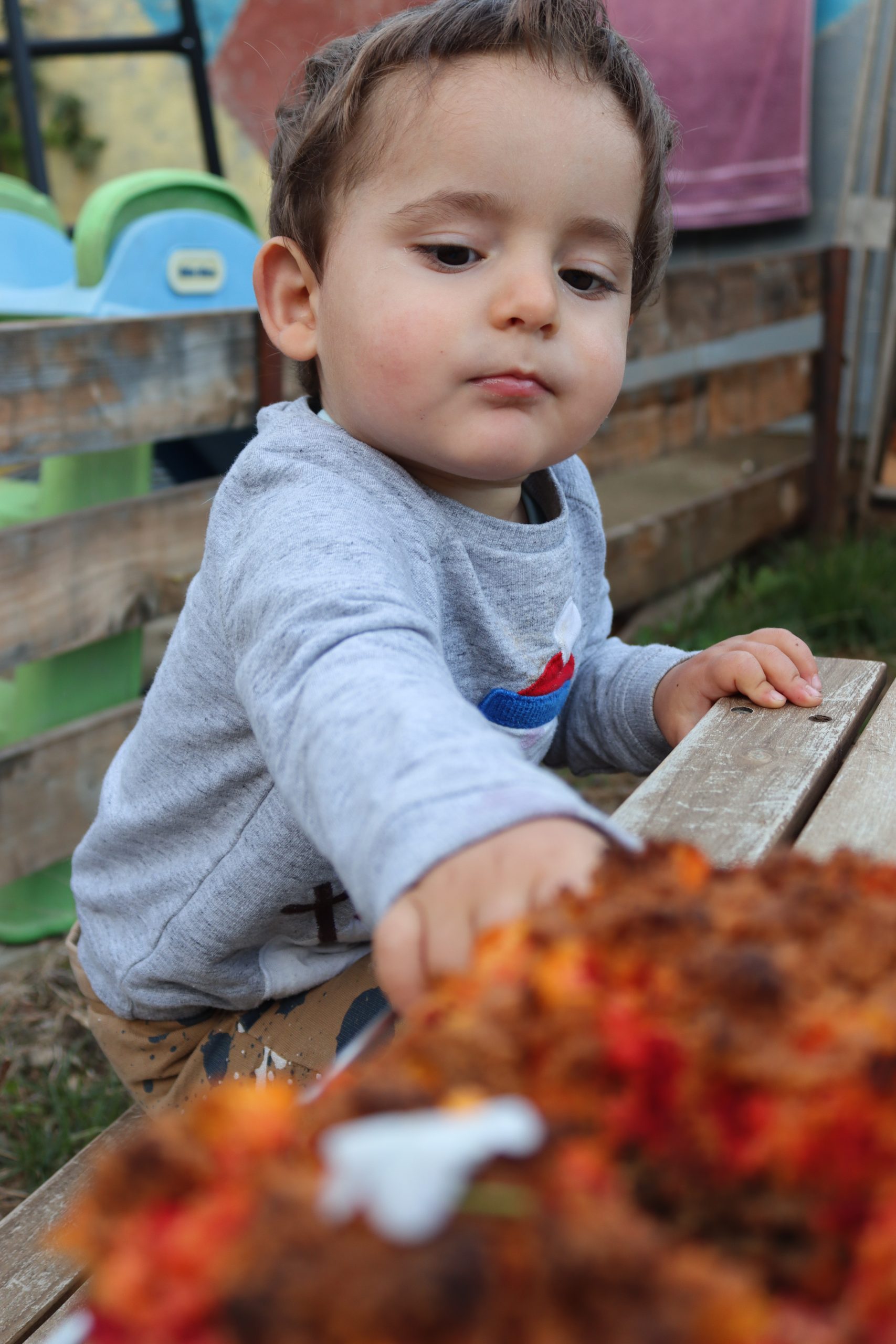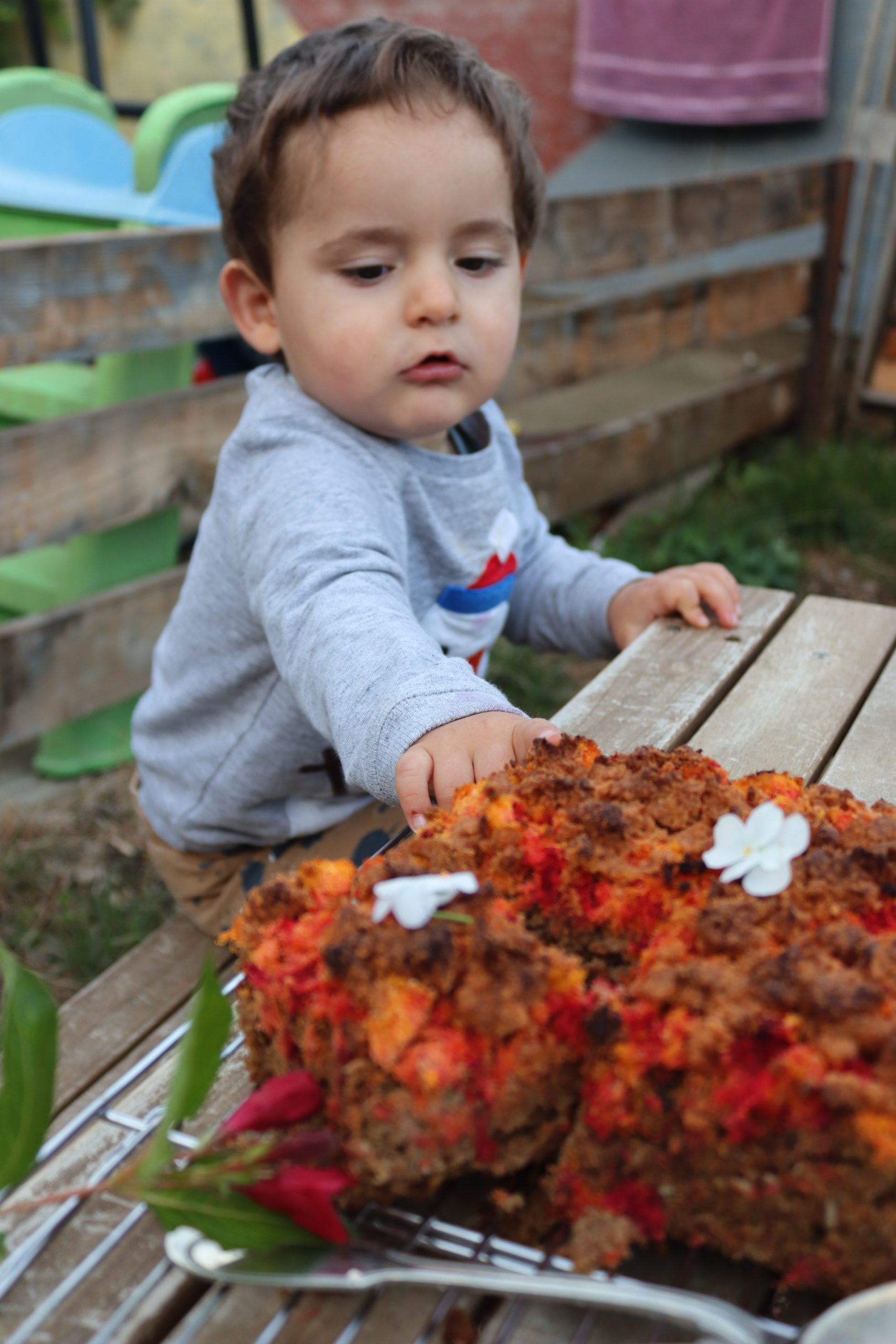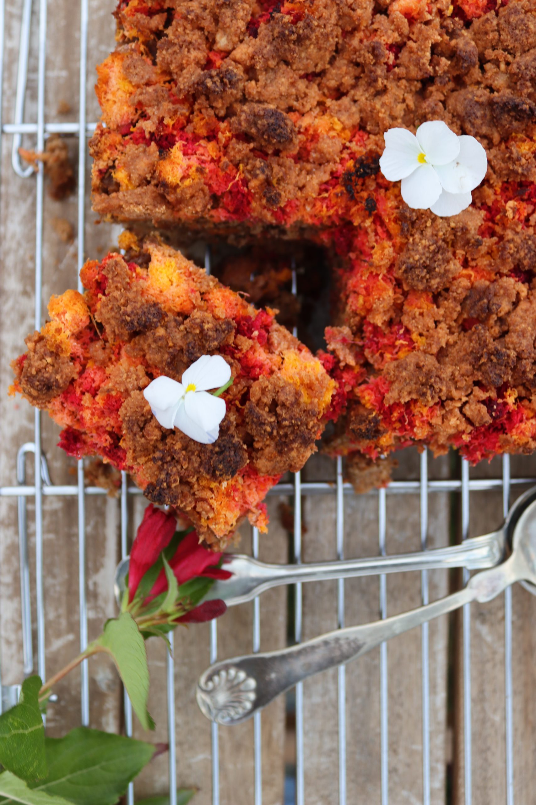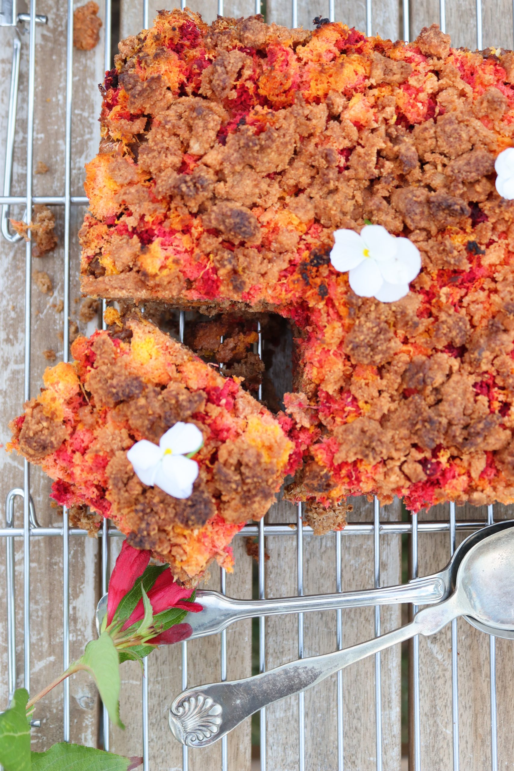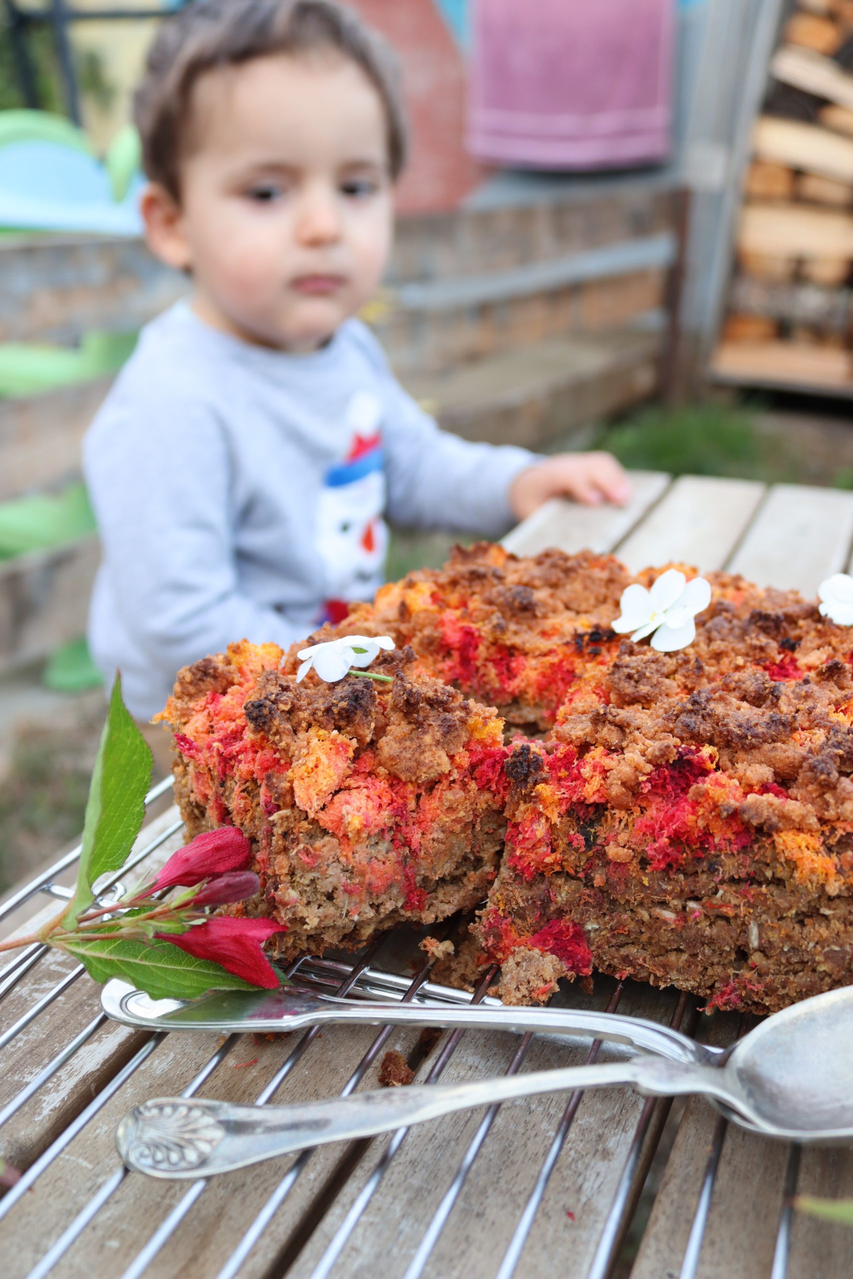 Изсипете овесената смес в тавичката и заравнете равномерно. Отгоре разпределете „опилките“ от моркови и цвекло. Поръсете с 2с.л еритритол, ако обичате по-сладък десерт.