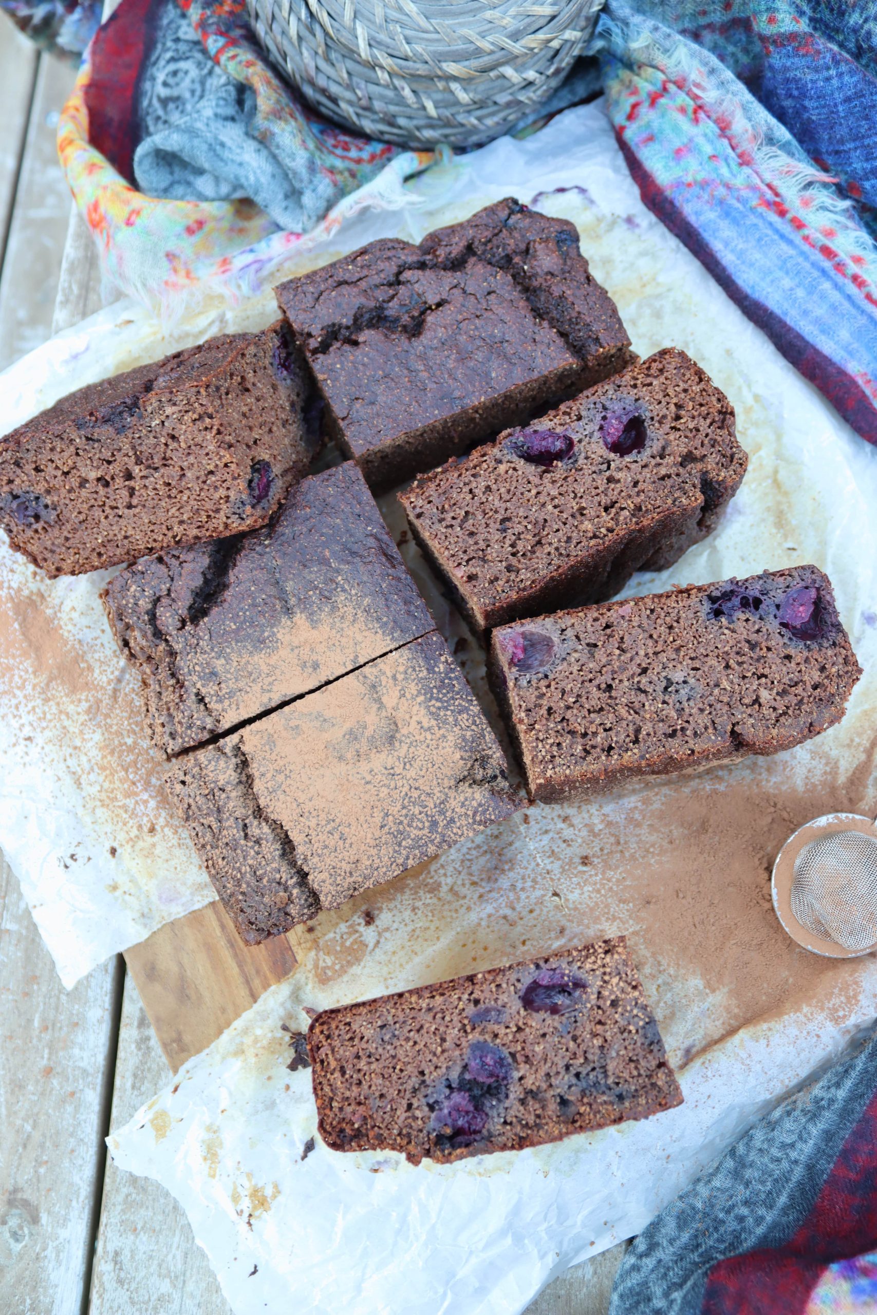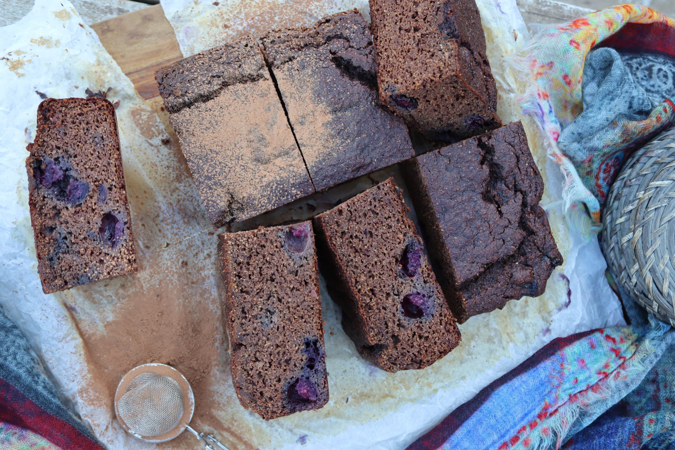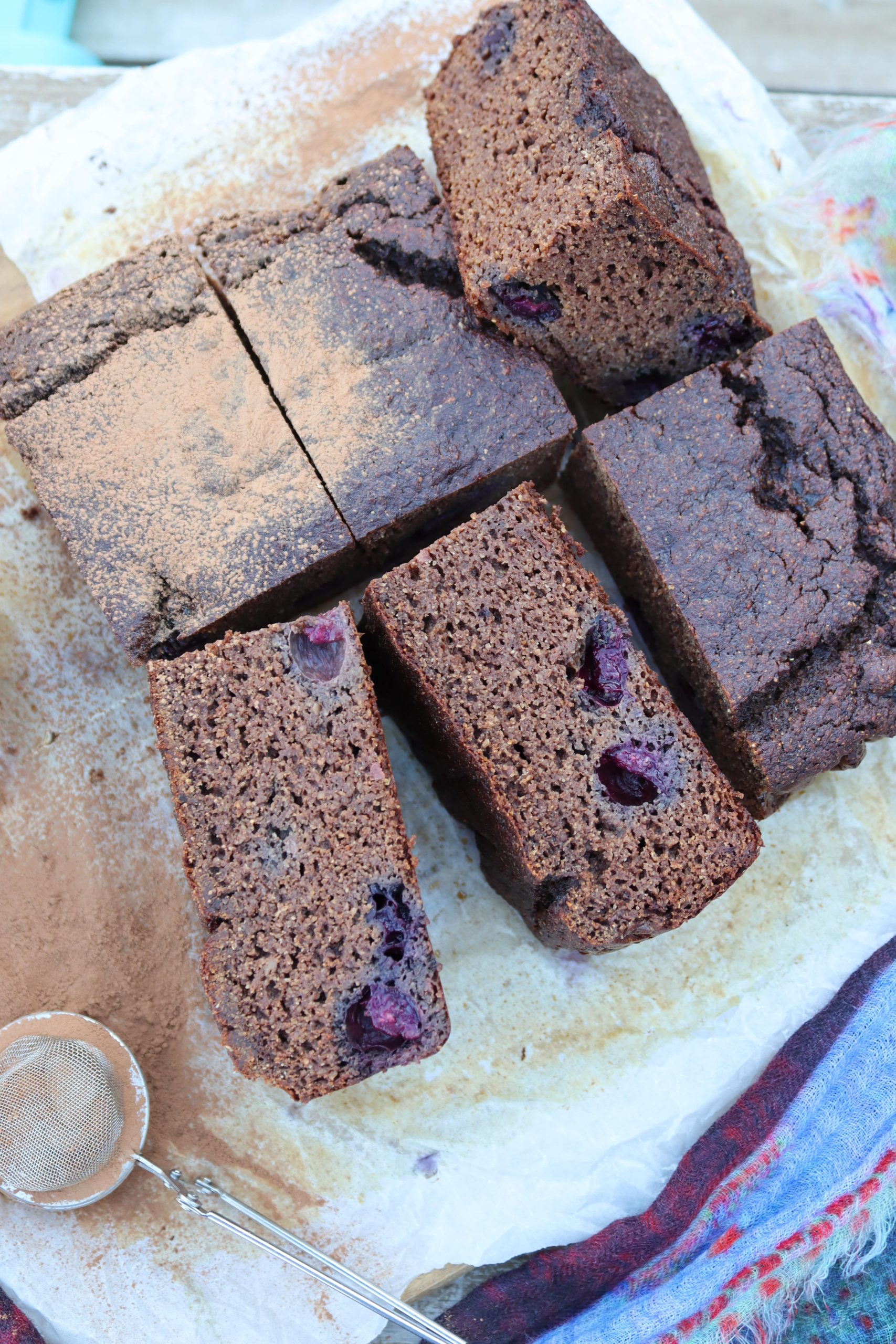 Сухите съставки дипете при мокрите и разбийте до еднородност на тестото. Добавете боровинките и разбъркайте внимателно. Изсипете в тавичката и сложете да се пече за около 40-45 минути.