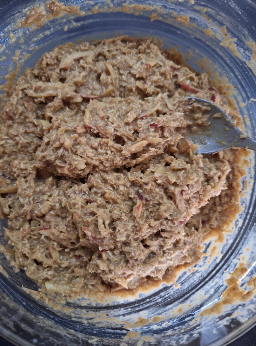 Добавете сухите към мокрите съставки и разбийте до хомогенност. Добавете ябълките и разбъркайте до хомогенност.