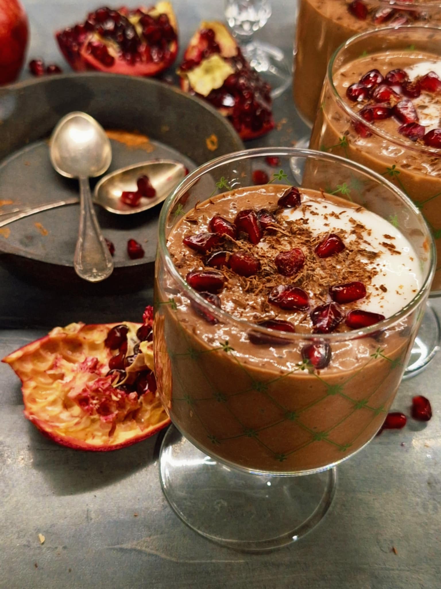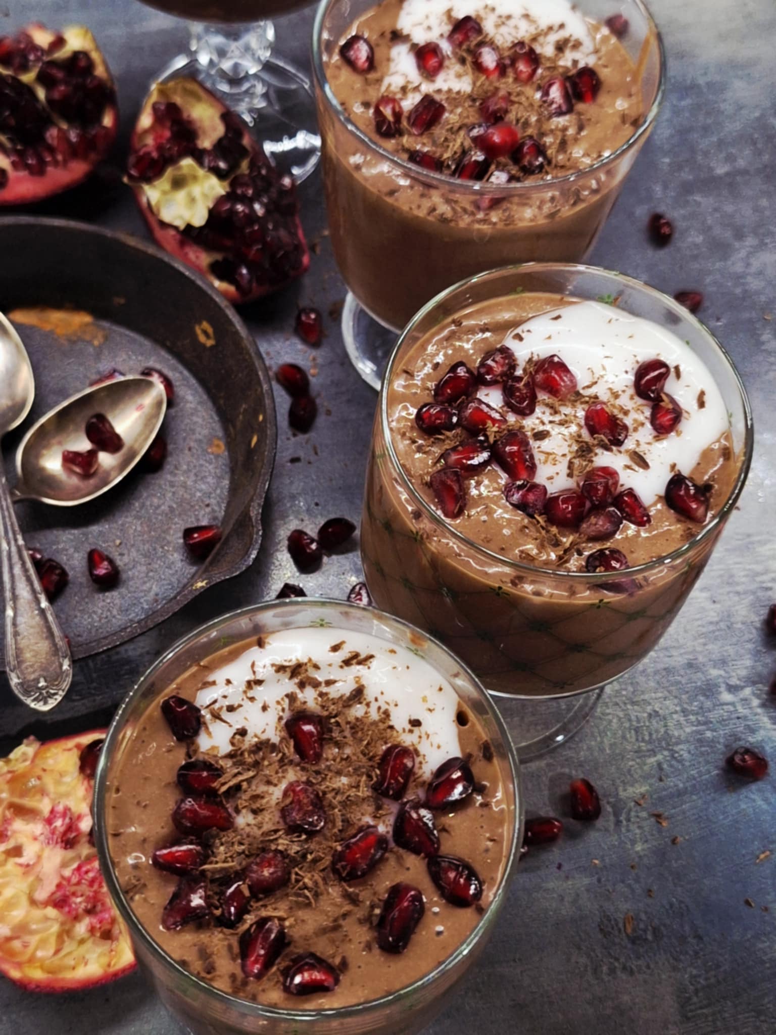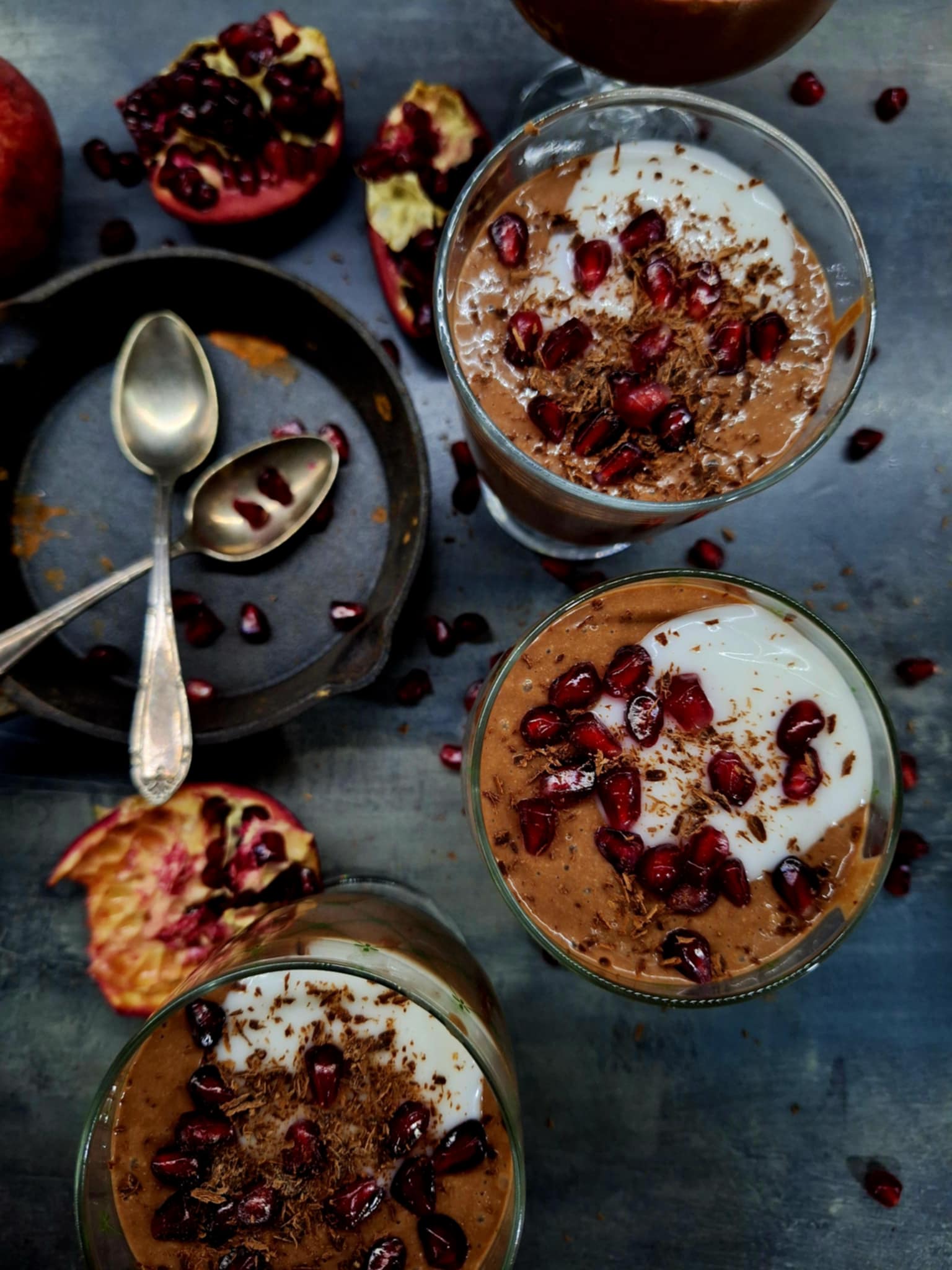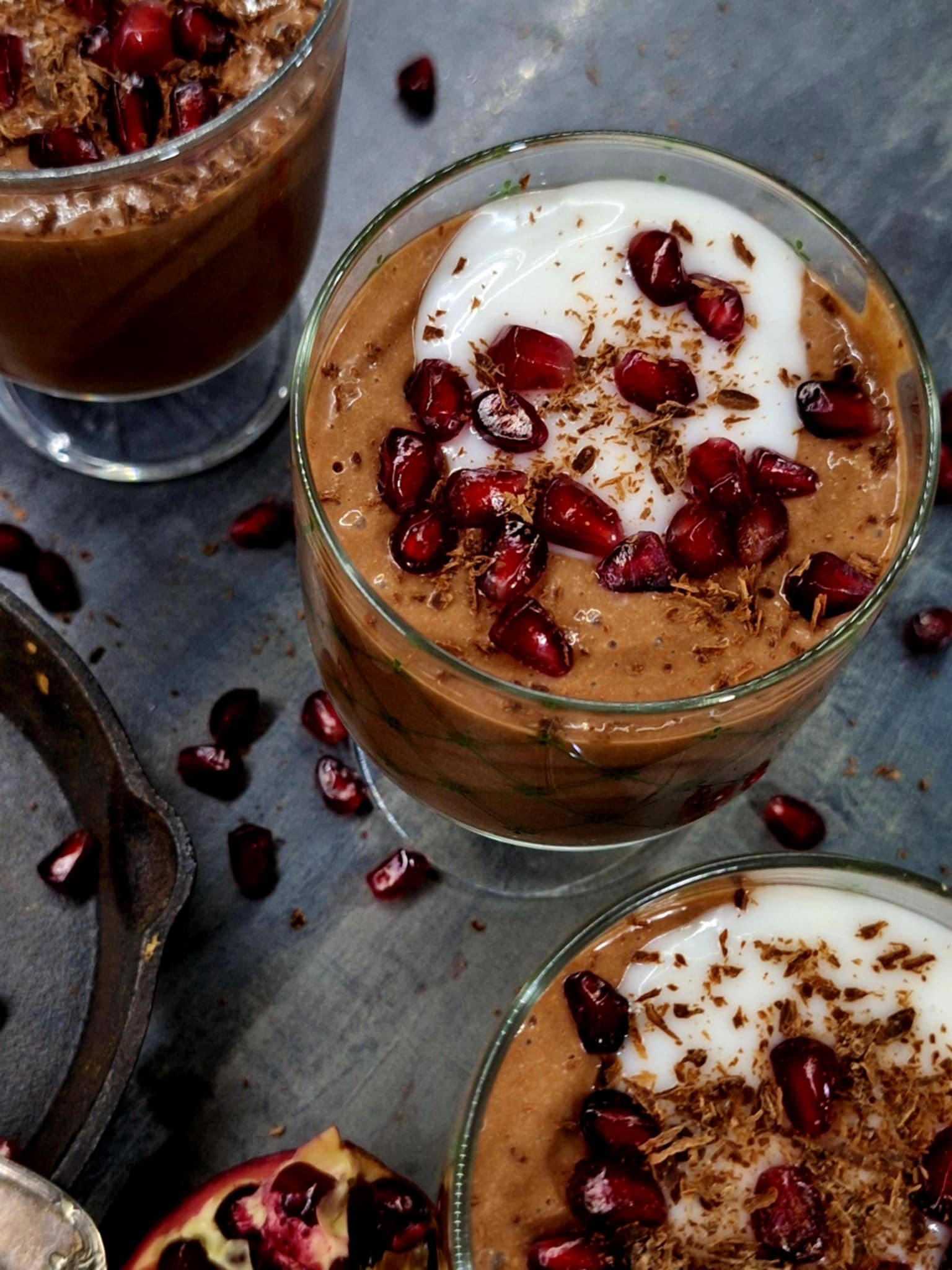 Преди поднасяне добавете по 1ч.л кокосова сметана, зрънца нар и настържете шоколад.