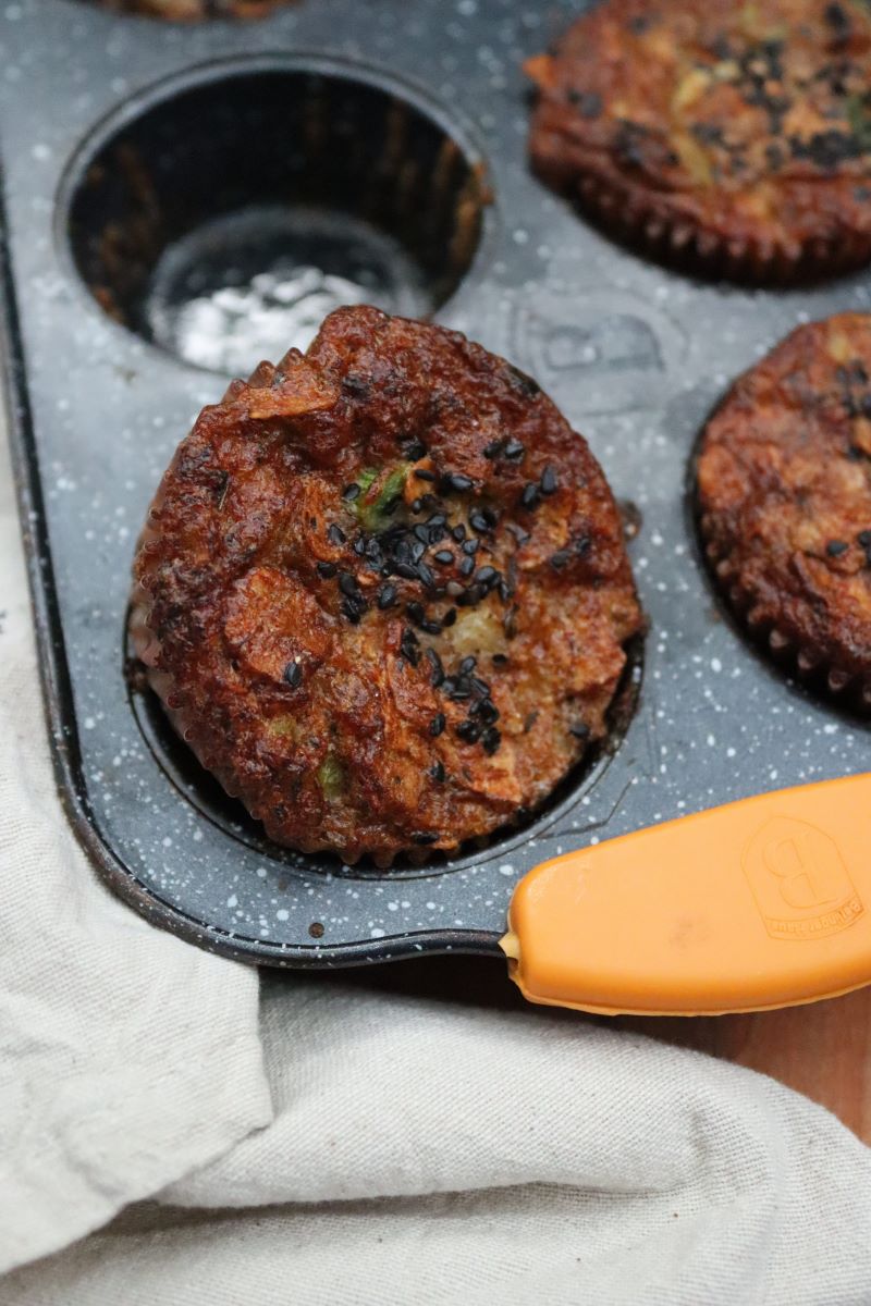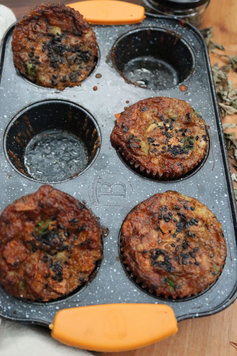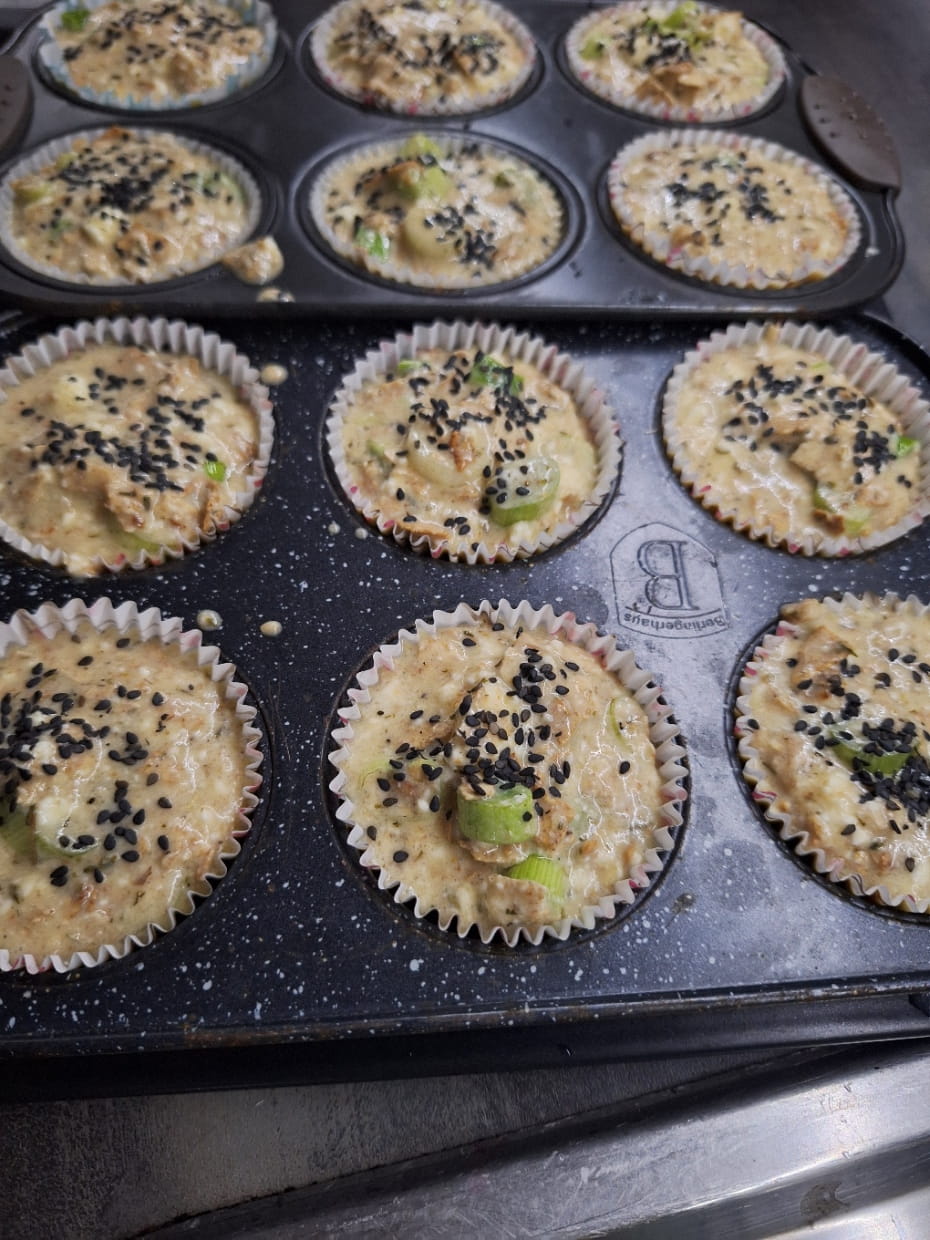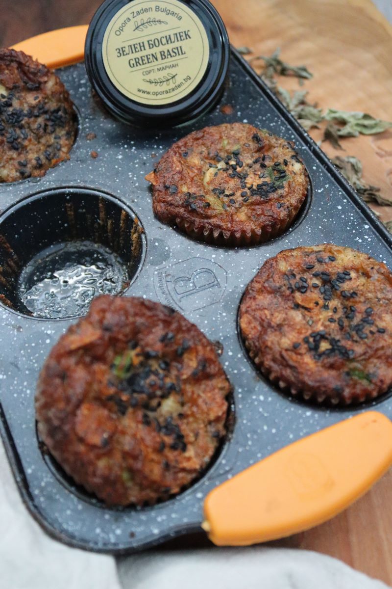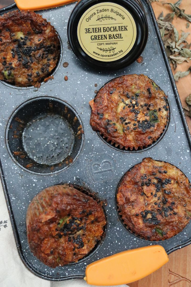 Последни сложете сиренето и кашкавала. Разбъркайте и разпределете по формите. Поръсете отгоре със сусам и сложете баничките да се пекат около 20-22 минути или да златист загар.