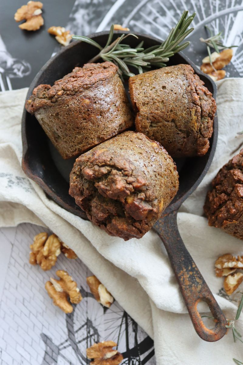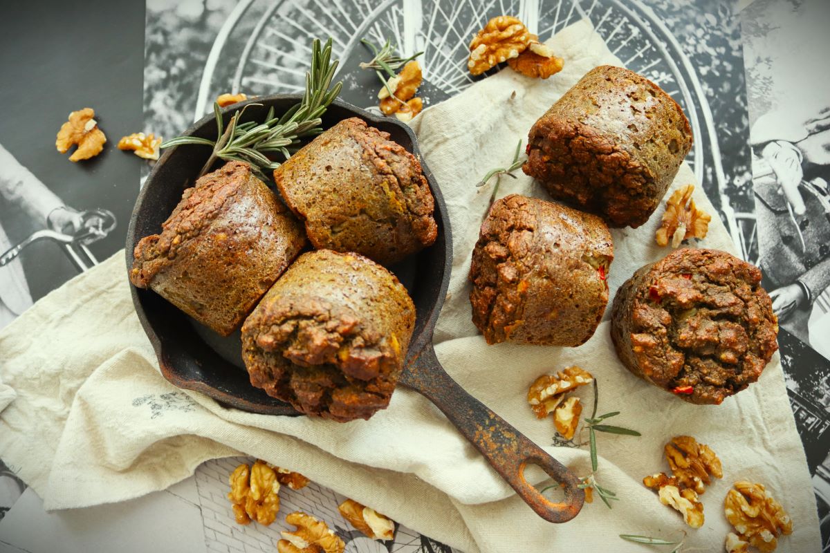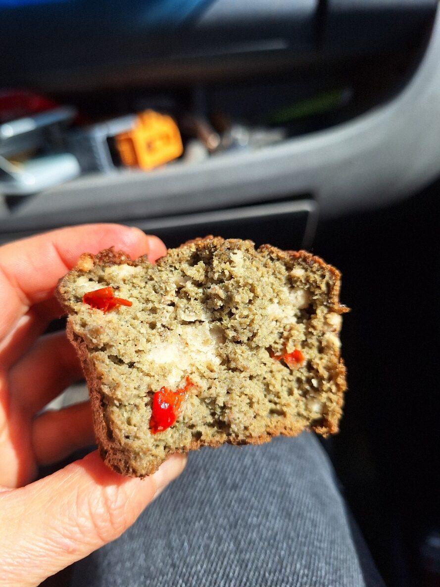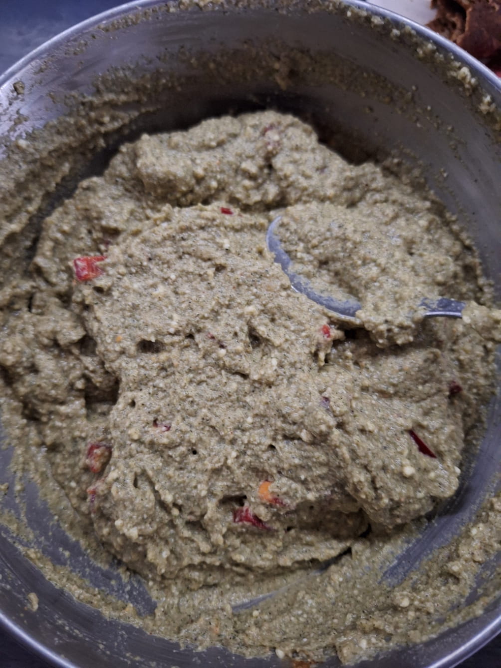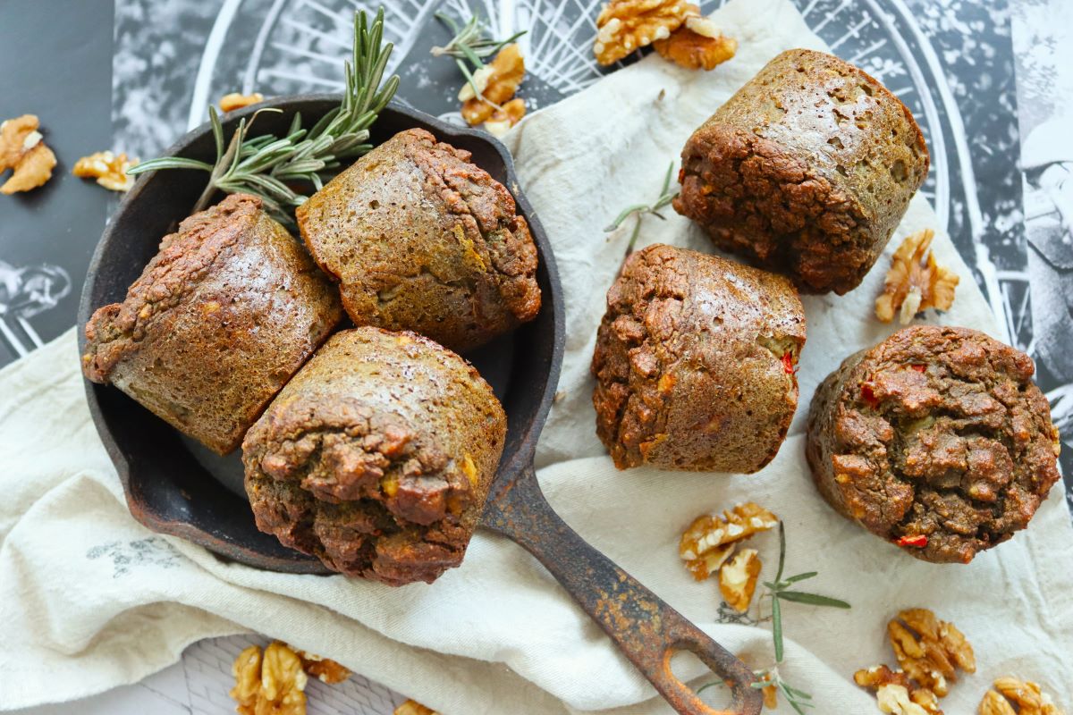 В друга купа разбийте заедно яйцата, оцета, белтъците и коприненото тофу. Добавете сместа от сухите съставки и разбъркайте до хомогенност. Нарежете пиперката на дребни парчета и я добавете. Натрошете ядковия деликатес дирекно в тестото за баничките и разбъркайте отново. Оставете за 5 минути, за да се активира бекпулвера.