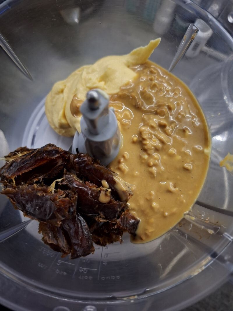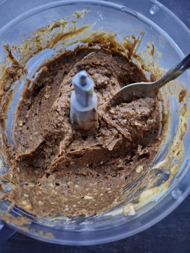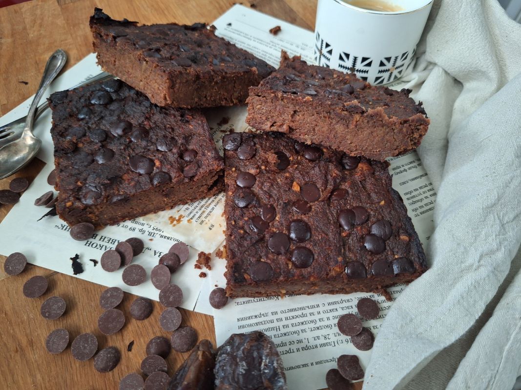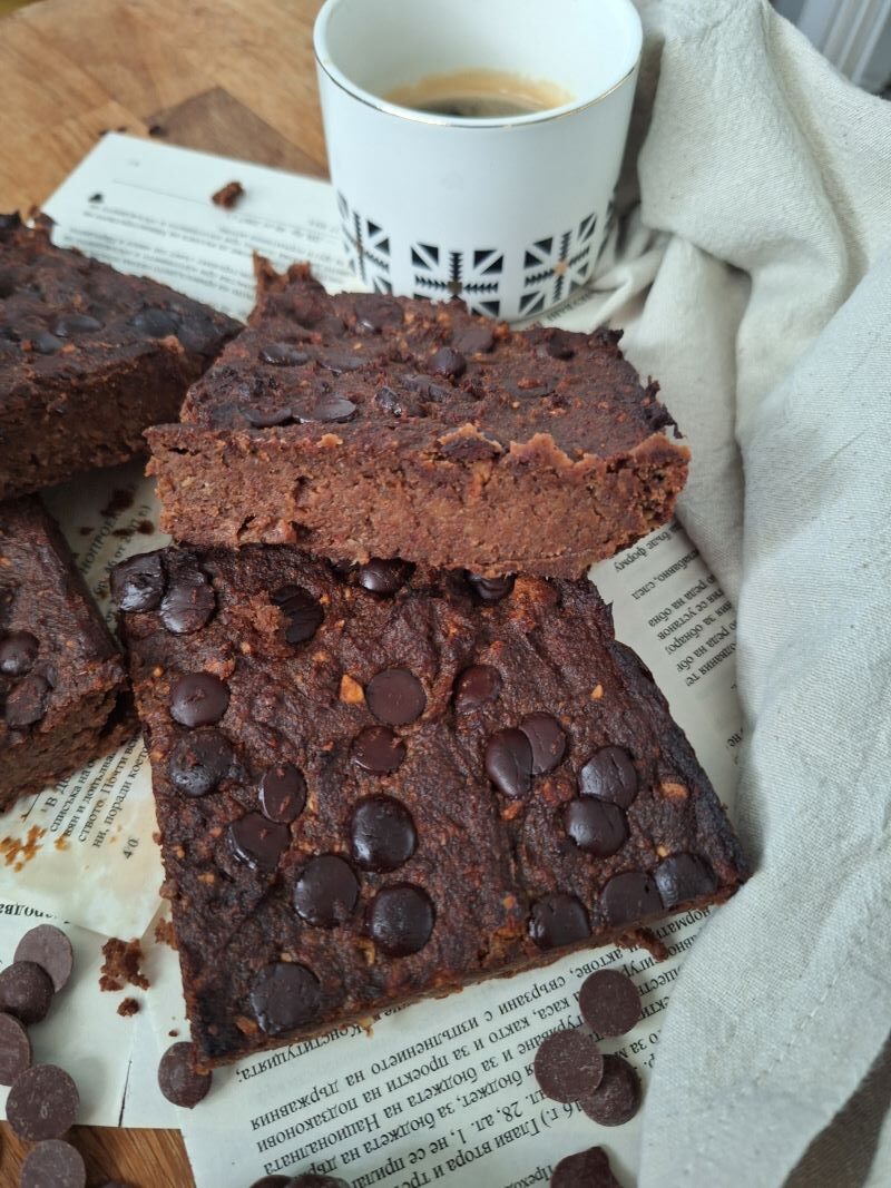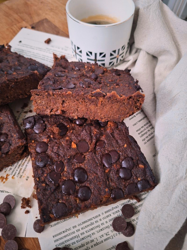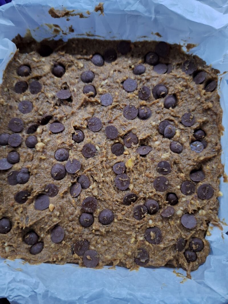 Вземете кухненския робот, снабден с S-образен нож, и сложете в него всички продукти без шоколадовите капки. Блендирайте до хомогенна каша. Изсипете в тавичката. Разпределете отгоре капките и ги притиснете леко, за да залепнат към тестото.