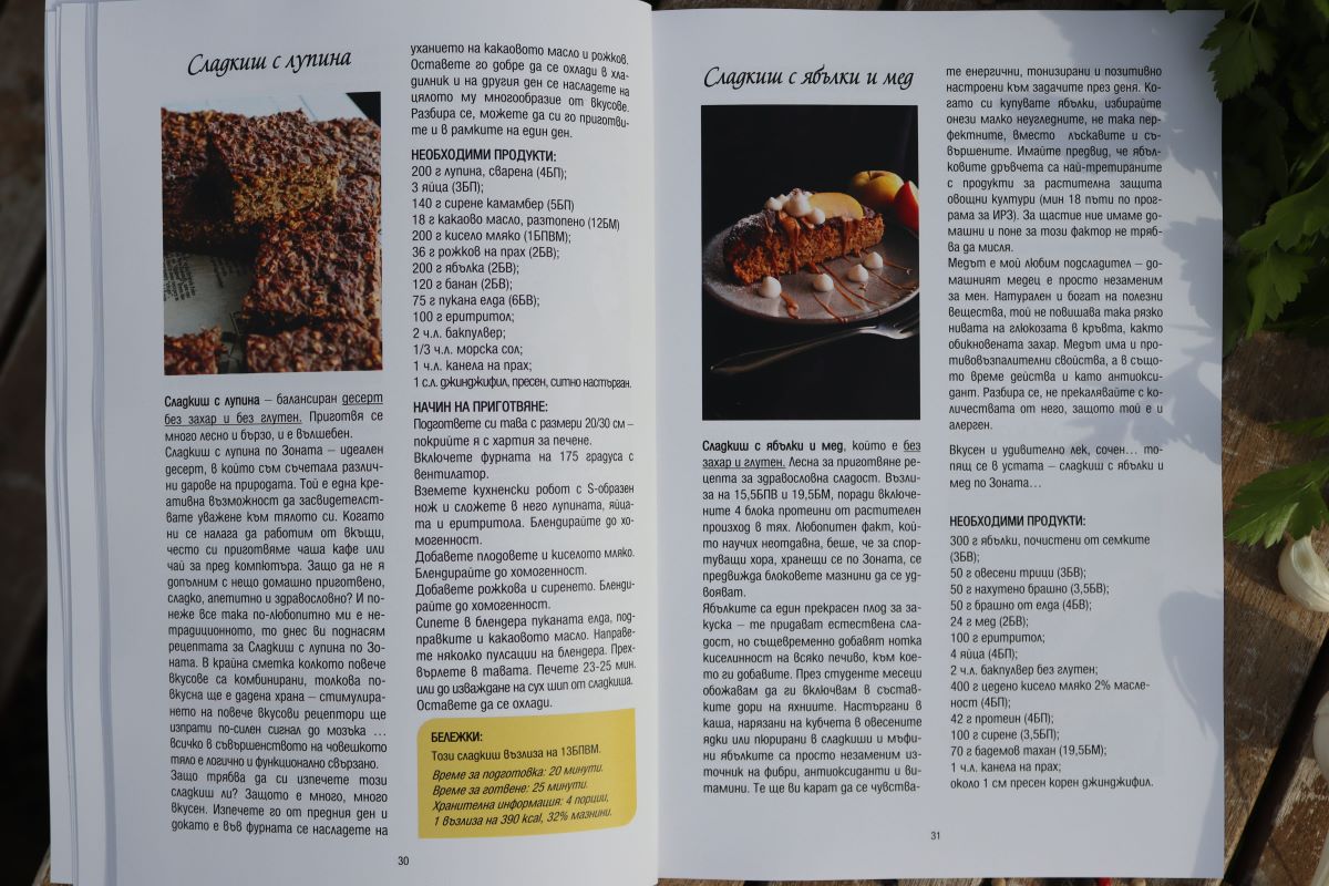 В книгата ще намерите 80 рецепти, които са балансирани по Зоната. Те са разделени в 4 раздела: закуска, брънч, обяд/вечеря, десерти. Те са без захар, без глутен или пълнозърнести и/или без млечни продукти. Рецептите са подходящи за приготвяне както в забързаното ежедневие, така и за специалните моменти със семейството и приятелите.